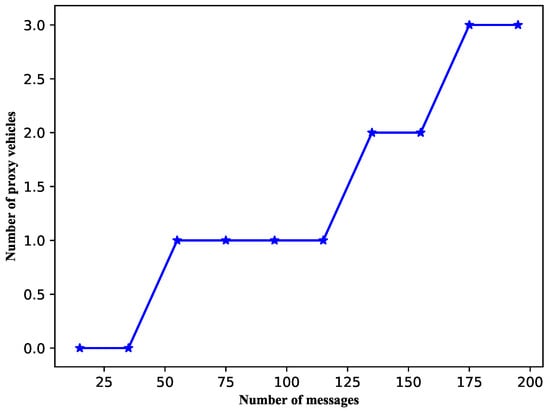 To analyze the performance of the PVBA scheme, we set the following simulation conditions. The number of vehicles covered by the RSU was 100, and the probability that vehicles send a message in every 300 ms was 0.8. Since the dwell time of a vehicle within the RSU coverage is associated with the velocity of the vehicle and the distance between the vehicle and the RSU, the maximal number of messages sent in the minimum dwell time can be calculated. Figure 4 shows the comparison of PVBA, ASMA and MAEC [27] from the perspective of the verification overhead. As shown, the MAEC scheme [27] has a higher verification overhead than the ASMA scheme. What is more, on the one hand, in the case where the number of messages is less than 35, the overheads of the ASMA scheme and the PVBA scheme are the same, while the overhead of the MAEC scheme [27] is slightly higher. On the other hand, in the case where the number of messages is greater than 35 and less than 90, the PVBA scheme has a higher verification overhead than the ASMA scheme and the MAEC scheme [27], because the computation power of the selected proxy vehicles is lower than that of the RSU. In the above two cases, we prefer to use the ASMA scheme to complete the verification tasks. However, in the case where the number of messages is greater than 95, the overheads of the ASMA scheme and the MAEC scheme [27] increase linearly, while the overhead of the proposed PVBA scheme increases slowly. The relationship between the number of messages and the number of proxy vehicles is shown in Figure 5. Obviously, the more messages there are, the more proxy vehicles are required. In summary, the PVBA scheme has obvious advantages when the number of messages is large and can effectively improve the verification efficiency.
