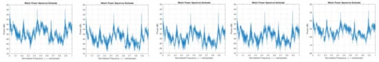 Power spectral density (PSD) estimation transforms time-varying spatial features into frequency features. The PSD estimation transforms time-varying spatial data into frequency spectra. As HOG of DGF is computed for consecutive gait images, the PSD is computed for the entire sequence of gait images representing the gait cycle. Power spectral density estimation of stationary single-image gait data is adapted with the help of Fast Fourier Transform (FFT). Transforming spatial gait features into the frequency domain has two-fold benefits: it helps to identify frequency spectra (band) for a significant spatial feature, and it performs feature dimensionality reduction. Figure 6 depicts the spectral features obtained by adapting FFT to the response of the HOG operator, where the PSD gait features in frequency are plotted along the y-axis and in normalized frequency along the x-axis.