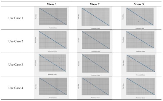 “STPS features and SVM classification model-based gait recognition” is evaluated on a locally collected gait dataset that captures significant shape variance caused by appearance variance. The proposed research results under each use case and viewing angle are discussed in the next section. The experimental results of “STPS features and SVM classification model-based gait recognition” are evaluated on all four use cases of the SACV gait dataset captured under view 1 (45°), view 2 (90°), and view 3 (135°) viewing angles. The accuracy achieved in four use cases under each view is mentioned in Table 1. Figure 7 depicts the confusion matrix of the training phase in use cases 1–4 and views 1–3.