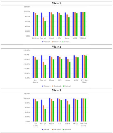 This pattern is evident from Table 2 that existing techniques achieve good accuracy for use case 1 under view 1–3, but this accuracy declines in use case 2 and use case 3. At the same time, the STPS gait feature with the SVM classification model has consistent accuracy across all three views and use cases. The evaluation of STPS gait features for gait recognition in three views with all three appearance use cases indicates that STPS gait features are robust to view appearance and to outperform gait silhouette-based techniques [68,77,105,106,107,108]. Gait recognition based on STPS features has achieved consistent accuracy in use case 4 and views 1–3, as mentioned in Table 1.