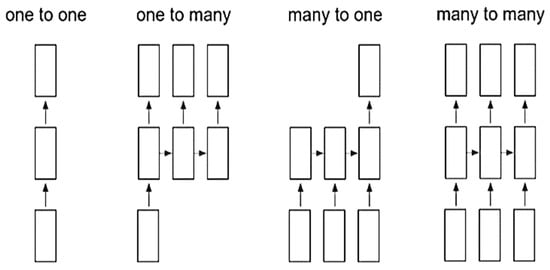 Some of the applications of RNN are image captioning [], time series prediction [], machine translation [], and NLP [,], etc. RNNs are divided into four categories: one to one, many to one, one to many, and many to many []. Figure 3 shows the categories of RNN, and Figure 4 explains simple RNN.