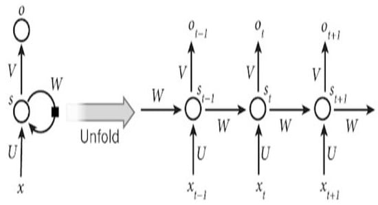 In the above diagram, x is the input state, s is the hidden state, and O is the output [,]. The network’s weights are U, V, and W. The internal architecture of the RNN cell is explained in Figure 5.