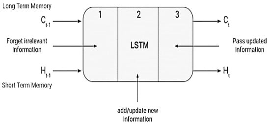 A long short-term memory network, also known as LSTM, is an advanced RNN that can store information for a long period of time. It can handle the vanishing gradient problem encountered by RNNs. Depending on the data, the network may or may not retain the memory. Through its gating mechanisms, the network maintains its long-term dependencies. In the network, the memory can be released or stored on demand based on the gating mechanism. Gates are the basic three components of an LSTM cell [,]. The forget gate is the first section, the input gate is the second, and the output gate is the third, as shown in Figure 6.