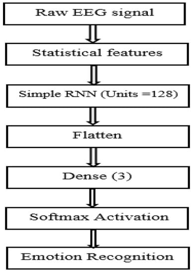 Learning features are determined using the RNN layers, and a dense layer is used to classify them into emotions from raw EEG signals. Simple RNN is used in this study. It is a simplified version of the real RNN in Keras. The loss function is a sparse categorical cross-entropy, and the optimizer used is an Adam optimizer. Figure 11 shows the RNN model used in this work for EEG-based emotion recognition.