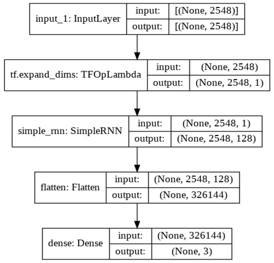 Table 2 shows the Keras implementation of the RNN architecture and a detailed explanation of the RNN model with input and output vector shapes, as shown in Figure 12.