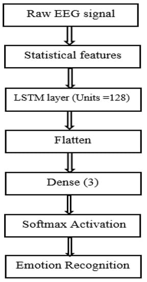 Learning features are determined using the LSTM layers, and a dense layer is used to classify them into emotions from raw EEG signals. Figure 13 shows the LSTM model for EEG-based emotion recognition. From the Keras API layers, the LSTM layer and dense layers are imported. Here, we used the LSTM layer with 128 internal units, and the return sequence is kept true. For each input time step, return sequences generate the hidden state output. The loss function is sparse categorical cross-entropy and the optimizer used is an Adam optimizer.