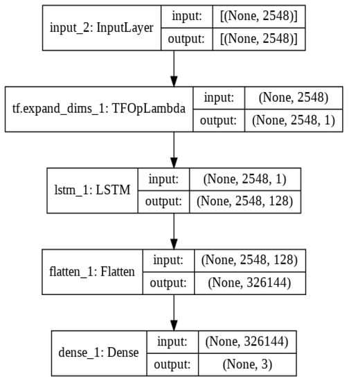 Table 3 shows the Keras implementation of the LSTM architecture and the detailed explanation of the LSTM model with input and output vector shapes, as shown in Figure 14.