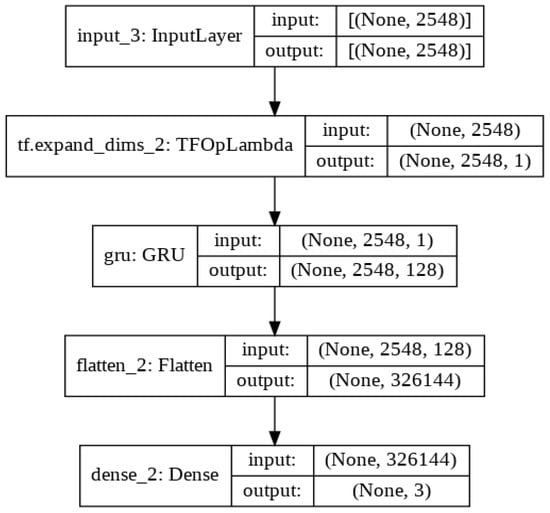 Table 4 shows the Keras implementation of the GRU architecture and the detailed explanation of the GRU model with input and output vector shapes, as shown in Figure 16.
