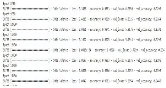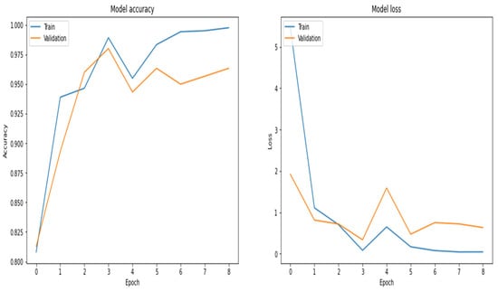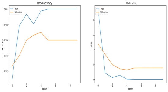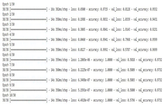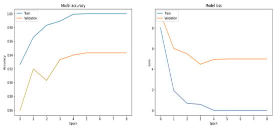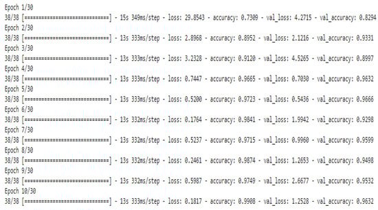 Figure 18 shows the accuracy and loss of the RNN model. When the number of epochs changes, the loss and accuracy values also change. Table 5 displays the confusion matrix for the test data of 640 samples, and Table 6 shows the performance metrics of the model calculated by using the confusion matrix.