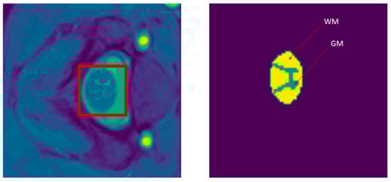 (left) Image slice of the spinal cord’s white matter (WM) and gray matter (GM). (right) WM and GM true-mask segmentation. The red rectangle shows the area of interest in the spinal cord displaying both gray matter and white matter.