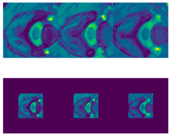 The variability in the sizes of the MRI slices also creates a challenge for deep CNN models, because they require all input images to have a fixed size. Thus, fixing the size of the slices in the dataset is an important first step. One standard solution employed by many methods in the literature is to simply resize the images to a fixed size. However, we believe that this will introduce unnecessary aspect ratio distortions. This is especially true upon inspection of sample slices in Figure 3, Figure 4, Figure 5 and Figure 6 below, where we observed that the targeted GM region of interest was always at the center of the slice. Thus, we opted for another solution, where we simply crop a window of size 224 × 224 at the center of each slice. We selected the size of 224 × 224 because it is a standard size used in machine learning. Figure 3, Figure 4, Figure 5 and Figure 6 display slices of SCGM MRIs from subject 10 of each site, followed by the resulting cropped images. For site 1, the slice sizes are 100 × 100, which is less than the target size. Thus, instead of cropping the slices, they are padded with zeros.