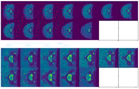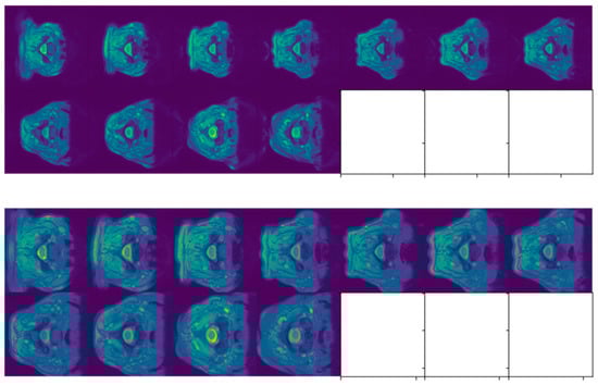 Slices of SCGM MRIs of subject 10 from site 2. Original image size is 320 × 320. A white square indicates the absence of an MRI slice. Original slices are displayed in the top row while cropped ones are exhibited in the bottom one.