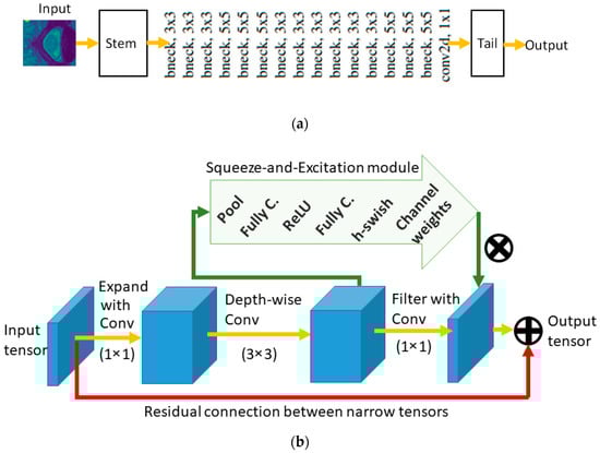 The IRB idea contributed to more reduction in the computation cost of the model. To reduce computations further, the authors also used linear activations after filtering the input and output tensors as opposed to non-linear activation functions (such as ReLU). Finally, the authors added an SE module [22] to the MobileNetV3 model. The SE module and its layers are shown in Figure 8b. However, unlike the other models which add the SE module as a separate block of ResNet [23] or Inception [17,24] CNN models, MobileNetV3 adds it in parallel with the IRB connection as shown in Figure 8b. The addition of the SE module increased the size of the model slightly but improved the accuracy and latency of the model.