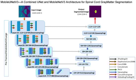 The proposed model combines the UNet architecture with MobileNetV3 for spinal cord GM segmentation in order to exploit its strong feature extraction capabilities, thus the name: MobileUNetV3. The question is how best to combine these two models, which is the main contribution of our research work herein. In Figure 9, we show the architecture of the proposed MobileUNetV3 model, including its different blocks together with the input feature maps. In the encoder part, the selected MobileNetV3 layers are applied with downsampling to reduce the image size. In the decoder part, the upsampling and transposed convolution are applied to generate a segmentation mask for each input image.