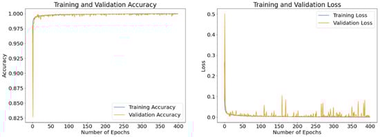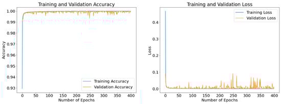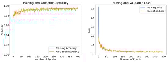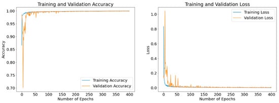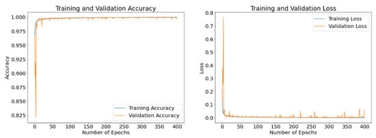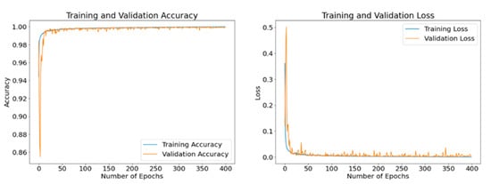The purpose of these results is to exhibit epoch-based evolutions of the obtained loss and accuracy values of the model as it learns. The displayed results are obtained using different optimizers with a batch size of 8 and running up to 400 epochs. Figure 11, Figure 12 and Figure 13 display the curves of training and validation accuracy, as well as the curves of training and validation loss for the three optimizers: SGD, Adam, and RMSProp, respectively. A blue color is used for training and orange for validation. We observe that as the number of epochs increases, the accuracy increases while the loss function decreases for all three optimizers. Overall, the model is learning well and is stable even as the number of epochs is increased. From these results, we notice that the two optimizers, Adam and RMSProp, produce higher accuracy results and lower loss values than SGD.