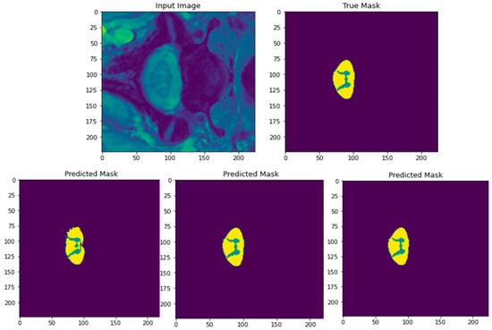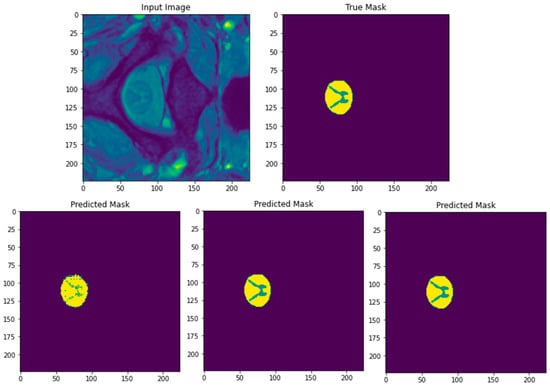 Figure 14 shows the results of segmentation of a test input image using SGD, Adam, and RMSProp optimizers with a batch size of 8 and using up to 400 epochs. The top row in the figure depicts the input image of SCGM followed by its ground truth mask to the right. The bottom row in the figure shows, from left to right, the three predicted masks of the segmented image for SGD, Adam, and RMSProp optimizers, respectively. From the visual analysis of these predicted masks, we can clearly see that both Adam and RMSProp produce nearly the same result. However, the predicted mask generated by SGD lacks in clarity, where the butterfly profile of the GM in the original image is not fully shown, in addition to the presence of jagged contours in the WM area. Therefore, we can conclude that the SGD optimizer should not be recommended for SCGM segmentation. To select the best performing optimizer among the remaining two, an analysis of their segmentation results in the form of performance metrics will be needed next to differentiate between them.