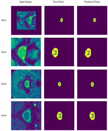 Segmentation results of four MRI slices from the four previously mentioned sites. The following slices are selected from sites 1, 2, 3, and 4, respectively: Slice 1 from subject 15, slice 13 from subject 11, slice 6 from subject 15, and slice 1 from subject 11. The RMSProp optimizer, a batch size of 8, and 400 epochs are employed with MobileUNetV3 in this set of experiments.