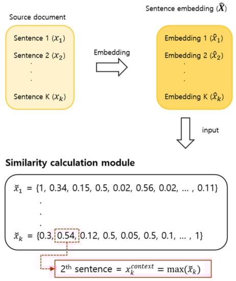 As document-level contexts often include several sentences, it is important to capture long-range dependencies and identify relevant contextual information. In this study, a sentence similarity measure is proposed to identify sentences with highly relevant contextual information in the current sentence. As shown in Figure 1, all K sentences in the document were converted into embedding vectors using a universal sentence encoder or Sent-BERT. The embedding vector is represented by . The similarity score of the current sentence was then measured with respect to all the other sentences in the document. The similarity score metrics consisted of cosine similarity, Euclidean distance, and Manhattan distance. The result of similarity in -th source sentence is denoted by,
