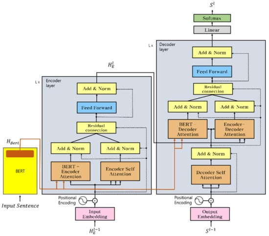 Similar to the encoder layer, the first attention of the decoder is the multihead encoder–decoder attention. The second attention model incorporates BERT into the decoder attention. is the output of the hidden self-attention representation in the decoder. The key and values are the last hidden layers of BERT. This is denoted by . These two types of attention are expressed as