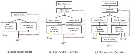 where is inserted into the feed-forward network. Each attention was calculated using the residual connection and normalization. The encoder then outputs from the last layer. The decoder architecture is similar to that of the encoder. Let denote the hidden representation from self-attention in the decoder preceding time step . This is the value obtained after positional encoding before self-attention. Positional encoding is embedded and added to the decoder inputs to indicate the position of each word. Let denote the residual connection from the BERT-decoder attention function.