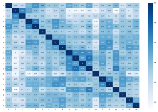 Heatmap matrix of the scores assigned to each sentence after measuring the similarity. Only 20 sentences were extracted.