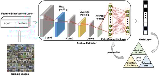 Most of the current hashing methods are combined with the deep neural network to analyze the semantic structure of the image from various angles, considering how to maintain the semantic structure and better combine the neural network with the extracted image features to capture various aspects [17]. In recent years, the methods of image enhancement [18] and image feature space optimization [19] have also achieved success. Inspired by these methods, we consider whether we can optimize the image features from the perspective of features to remove feature redundancy and achieve deep hashing. In addition, thanks to the rise of contrastive learning [20], we are inspired to obtain similarities between images by contrast. Therefore, we propose a deep network architecture with feature enhancement layer as shown in Figure 1 to learn hash codes better. First, the feature enhancement layer constructs the mapping from labels to image features by establishing the relationship between labels and image features and optimizes the features. Then, the image features are further extracted and fused through the feature extraction layer to obtain the most important image features. The network output is converted to a binary code through a hash layer by applying regularization [21] to better approximate the expected discrete values. The loss function makes similar images attract each other, shortens the distance between them, and makes dissimilar images repel each other, increasing the distance between them. This can make the learned Hamming structure more closely approximate the semantic structure of the images.