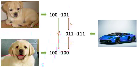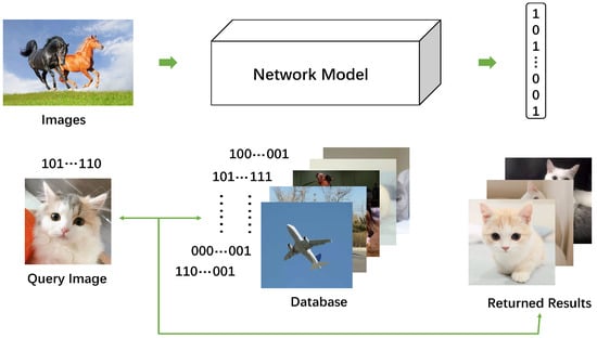 In recent years, with the huge increase in the amount of network data, tens of thousands of pictures have been submitted online every minute. It is very difficult for users to look for the pictures they need according to their various requirements. It is difficult to describe similar images by language and find them—perhaps in an attempt to find pictures that are similar to the content of the pictures, pictures that are semantically similar, or images that are similar in terms of their background. Similarity is chiefly divided into two types: one is visual similarity, and the other is semantic similarity. How to quickly process so much data is very important. Among the methods used, the approximate nearest neighbor search [1,2,3]—that is, searching for the closest and most similar data to the query data—has become a very important research topic. Traditional image retrieval methods manually extract the features of the picture and convert them into real values and accomplish an approximate nearest neighbor search by computing a certain distance between two image representations to obtain the most similar images. At present, the database contains a large amount of data; if the traditional image retrieval method is used, it will consume considerable energy and storage space. To resolve the difficulties of the low efficiency of traditional retrieval means, a hash method [4] is proposed. Hash retrieval technology generates a hash function through calculation, which maps the high-dimensional image data matrix after data processing into binary codes of a certain length without changing their original structure [5,6,7]. It maps the high-dimensional characteristic representation of the graphics to a compact two-dimensional code, realizes data dimensionality reduction, and can carry out measurement operations in low-dimensional space [8]. In this way, the retrieval results are obtained by approximate matching by calculating the difference [9] between the binary codes of the pictures and using this difference as a measure of the similarity of the images. Because binary representation is used instead of real value representation, the storage stress is greatly reduced, and binary representation is easier to query than real value representation, thus improving the efficiency of the search [10]. However, the retrieval efficiency of most hashing approaches today depends heavily on the characteristics they use, which are largely unsupervised and thus more suitable for processing semantically similar images than visually similar images.