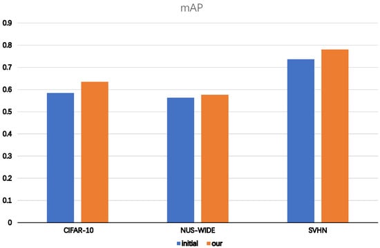 In contrast to the usual network architecture, we add feature enhancement layers, hash layers, and loss layers to better compute the performance of each layer. As shown in Figure 8, compared with the initial network framework, the performance of our network on each dataset has been slightly improved, which reflects the feasibility of our network architecture. We attribute the improvement to image feature augmentation, which emphasizes label information to connect with image features and is more able to preserve semantic information when extracting image characteristics.