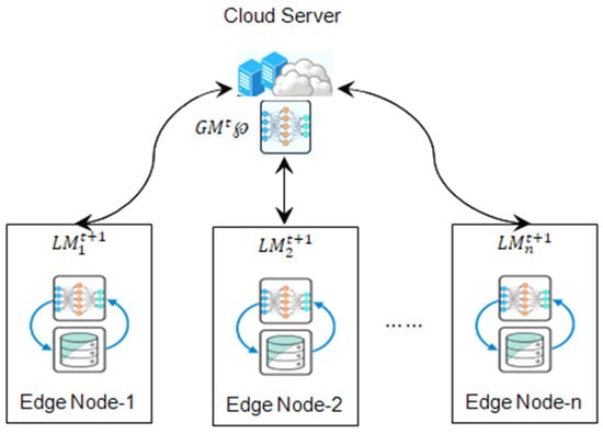 FL is a participatory machine learning process that allows participating machines to change model parameters regularly while storing all training data locally []. Edge-based FL allows edge nodes to learn a globally integrated model cooperatively without submitting private local data to a central server. Consider there are N edge nodes, each with its local dataset . Here Figure 2 shows a federated learning model. At each round t, the server sends a global learning model to all edge nodes. Select subset St of n nodes from N edge nodes. The edge node i optimizes the global learning model to get the local model for t + 1 round. The node i provides the updated model to the cloud server. The server updates the new model.