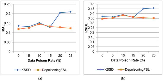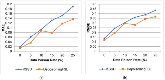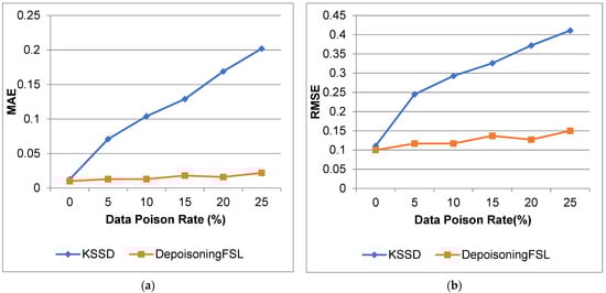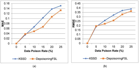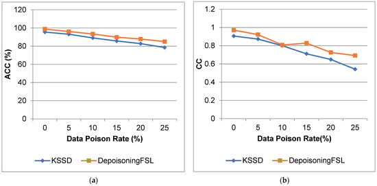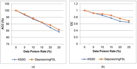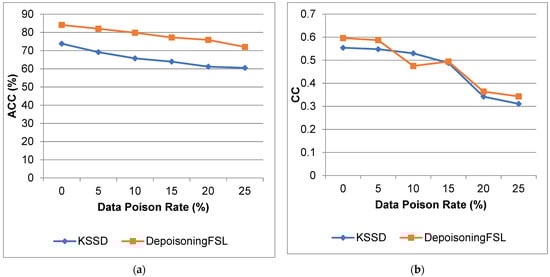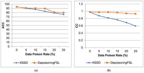 The proposed DepoisoningFSL is compared with K-nearest-neighbor-based semi-supervised defense (KSSD) [] with different data poisoning rates: 0%, 5%, 10%, 15%, 20%, and 25%.