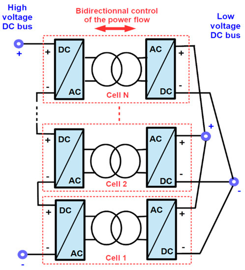 Modular structure of the DC/DC heart of a high-power SST connecting a high voltage grid to a low voltage one. The SST cells input connected in series allows operating with a high-voltage DC bus while a high output current is obtained by coupling the cells output in parallel.