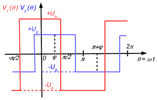 Supposing a constant input and output voltages ( ) over a short timescale, the power at the input Bridge 1 is and at the output of the bridge 2. Consequently, it is important to avoid pulse width modulation (PWM) commands for operating at the lowest possible switching frequency. This command corresponds to the rectangular voltages presented in Figure 3. The control variable is , the phase lag between the commands of the two IGBT bridges.