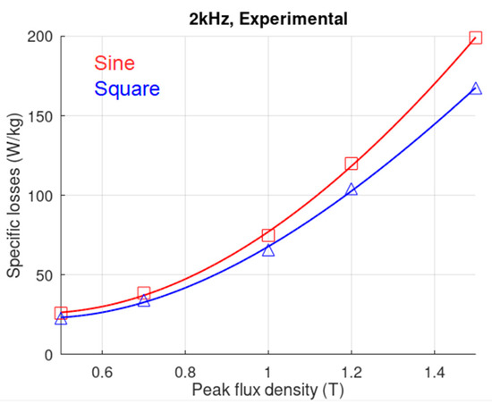A current broadband probe gives the magnetizing current while a voltage probe measures the secondary voltage. A numeric integration of the secondary voltage yields the average flux density in the core at any time. The core losses are computed using the primary current and secondary voltage to avoid the influence of copper losses in the primary coil. The computation applies the basic definition of the power with is the average value, on an exact number on periods, of the products of the recorded instantaneous values. Figure 6 compares the specific losses in the GOES wound core presented in Figure 4 at 2 kHz for square and quasi-sine voltages. For each measurement point, the inverter voltage increases rapidly from zero to get the desired peak flux density; data are recorded; the voltage is quickly reduced to zero. A deadtime of several minutes between consecutive measurements avoids a significant increase in the core temperature during tests. Figure 6 shows the classical increase in losses with the flux density. However, the losses remain lower for square voltages than for sine ones for the same peak flux density. Similar results are obtained for other frequencies over 1 kHz.
