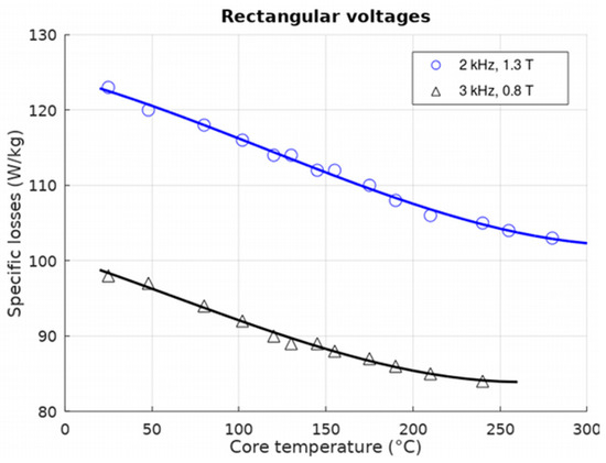 Core loss variations with the core temperature for rectangular voltages and for two operating points and (experimental results).
