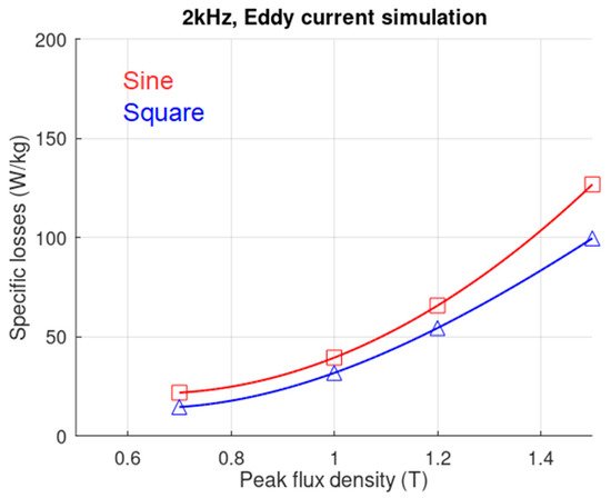 A comparison of Figure 6 and Figure 9 show that eddy current losses obtained by simulation are about half the measured core losses. Bertotti’s formula cannot be used for a non-uniform flux density, but the principle of losses separation remains valid. At 2 kHz, the static losses are low; therefore, the excess losses are of the same magnitude as the eddy current ones.