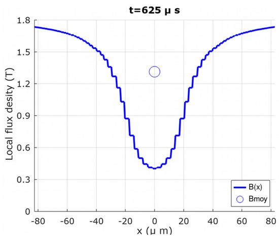Figure 10 shows an example of the local flux density inside a strip at a time corresponding to the peak value of the average flux density (1.3 T) for a square voltage at 2 kHz. The skin effect is a major phenomenon, where the GOES strip is saturated near its surfaces despite a lower peak average flux density.