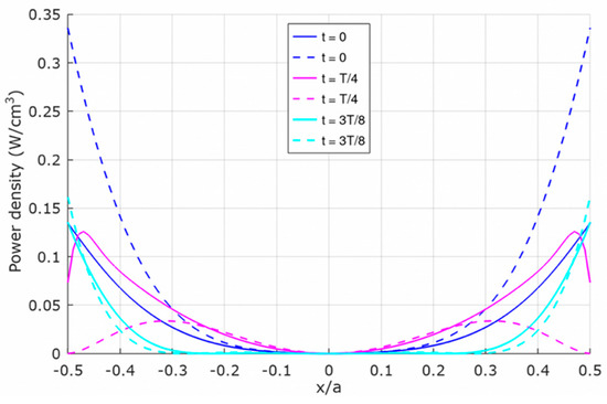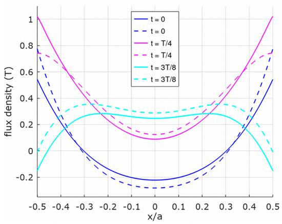 Figure 13 shows that most of the power density is concentrated near the strip surfaces. However, the spatial distributions are different. At t = 0, for instance, the power density for a sine voltage (blue the dotted line) is much higher than for a square one (solid blue line). At t = T/4 (magenta lines), the situation is inversed but with fewer differences. The mean value of the power density , computed with the temporal integration Equation (9), shows that eddy current losses are lower for a square voltage than for a sine one.