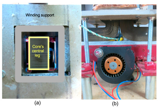 Transformer cooling system with airflows between the hot core and the winding at a standard temperature: (a) top view when the upper half-core is removed; (b) one of the two small fans providing airflows.
