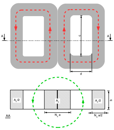 The core is made of GOES strips of width and thickness ; therefore and define the core area for the flux . The window area is . In this figure, the red dotted lines show the average flux line and the green dotted line the average current line that correspond to the average turn length . Equation (18) gives the average flux line and Equation (19) the average turn length .