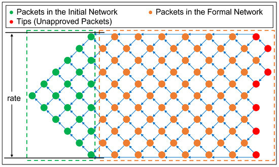 In terms of structure, FNT is divided into two parts: the Initial Network and the Formal Network. The Initial Network is used to initialize the network to reach the maximum data packet throughput gradually, and after the initialization is completed, it enters the Formal Network. In FNT, each node represents a packet submitted by a sensor in WSNs at a point in time, and after the FNT node is created, it needs to approve two specified FNT nodes and thus be attached to the network. The two approved FNT nodes are called the Tips of that node. The FNT node also needs to be approved by two new FNT nodes afterward, and they are called Approvers of that FNT node.
