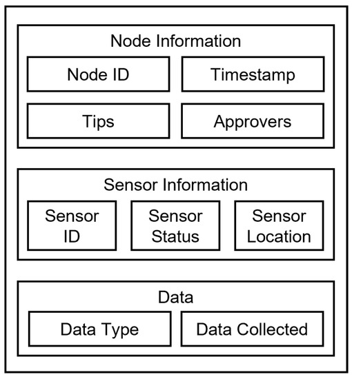 FNT node refers to the packet that contains the sensor data. An FNT node should contain three parts of information, node information, sensor information, and data collected by sensors. As shown in Figure 4, the node information contains the node ID, timestamp and its Tips and Approvers. Sensor information includes its ID, current operating status, and location. The data collected by the sensor needs to indicate its data type. Depending on the actual application of different WSNs, the information contained in the nodes may vary.