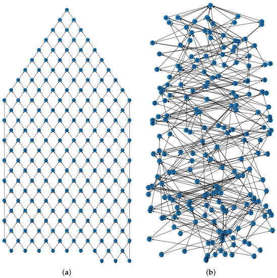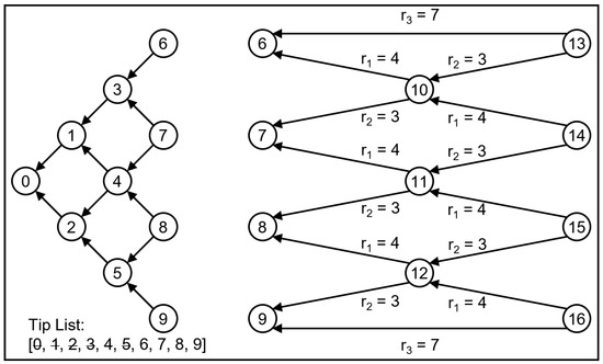 The difference in Tip Selection Algorithm (TSA) determines a very different structure of FNT and Tangle. Tangle uses MCMC and URTS algorithms as examples of tip selection strategies [31]. These strategies make each tip selection very random, accounting for the increased time and efficiency cost, which also complicates the structure of Tangle. In contrast, FNT avoids using complex tip selection algorithms and instead appends them with simple node index computation. In addition, each new node has predefined tips in the network, so there is no selection process. This also saves much time and computational effort. Figure 7a,b show a comparison of the structure of FNT and Tangle, with FNT being more concise and straightforward.