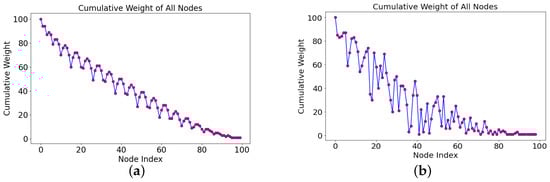 Taking a network with a rate of six and 100 nodes as an example, Figure 8a,b shows the cumulative weights of each node under the two structures of FNT and Tangle, respectively. The trend of the cumulative weights in the figures also reflects the difference between the two structures. FNT has a more straightforward structure, so the trend of the cumulative weights is stable. While Tangle has a complicated structure, the cumulative weight trend is unstable. The above examples are only used to compare the differences between the two structures. FNT does not use cumulative weights.