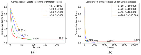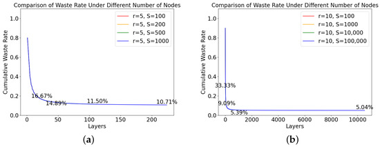 Figure 9a,b show the waste curves at rates of 5 and 10, respectively, and S represents the number of FNT nodes in the networks. The same rate causes the curves to overlap. In the figures, the cumulative waste rate decreases. When the rate is five, with 1000 nodes, the waste rate is . When the rate is 10, with 100,000 nodes, the waste rate is .