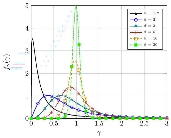 First, in Figure 1, the PDF of the -distribution is evaluated for different values of , with the average SNR being set to . We see that lower values of correspond to having a PDF more concentrated near the origin. Hence, lower values of SNR become more likely as is reduced. Conversely, as grows, we see how the SNR values tend to be more concentrated around its mean value .