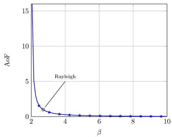 Figure 2 shows the AoF as a function of the parameter . We recall that the k-th-order moment of the -distribution is only defined for , so that the AoF is only defined for . We see that low values of correspond to high values of AoF, which implies a rather large fading severity. We see that for , which is coincident with the AoF under Rayleigh fading. Hence, fading severity under -distributed fading can be tuned with parameter , and even exhibiting hyper-Rayleigh behavior [27] in the AoF sense.