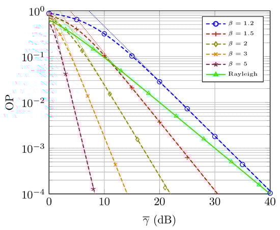The OP under -distributed fading is evaluated in Figure 3, again when considering different values of the parameter . The SNR threshold value is set to (i.e., dB). We see that the OP dramatically improves for larger values of , which is coherent with the insights obtained by the asymptotic analysis. Specifically, we see that the high-SNR approximation for the OP becomes very tight, and the OP curves have different slope, which only depends on . Interestingly, since the parameter that controls the decay of the OP is enforced to be strictly larger than one due to physical reasons, it is not possible for the -distribution to model an OP decay faster than the Rayleigh case (which always decays with unitary slope). Hence, according to the definition introduced in [27], the -distribution does not exhibit hyper-Rayleigh behavior in the OP sense.