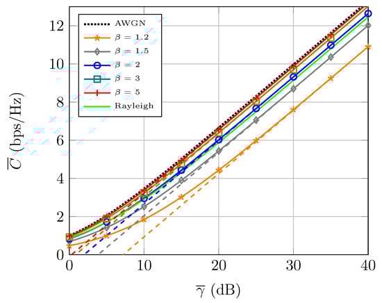 Now, aiming to gain some intuition into the role of the parameter on the average capacity, we resort to a high-SNR asymptotic analysis using the formulation in ([26], Equations (8) and (9)), which gives a tight lower bound for the average capacity in the form: