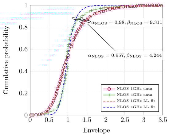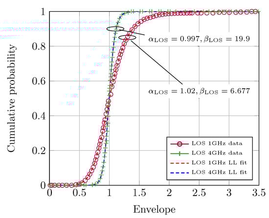 - Second, in the scenario under consideration, one would anticipate that LOS scenarios exhibit a lower fading severity than the NLOS ones, and that higher frequencies also experience milder fading because of the reduced relative importance of the diffuse components compared to the LOS ones. This is in coherence with the values shown in Figure 5 and Figure 6, on which the fitting (the channel fitting was performed using the cftool included in Matlab, with the criterion of finding the set of parameters () that minimize the root mean square error (RMSE) with respect to the empirical CDF. The empirical CDFs in [15] were obtained by using the tool WebPlotDigitizer, which allows to reverse engineer images of data visualizations to extract the underlying numerical data) over the empirical CDFs given in [16] is carried out using the parameterized version of the LL distribution. We see that the actual values for the parameters should be {6.677/19.9} and {4.244/9.311} for the 1/4 GHz scenarios, respectively. Hence, we confirm that a larger is associated with a milder fading scenario. As stated in [15], the estimated values for the parameter are close to unity in all instances.