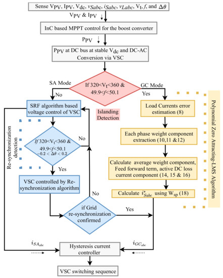 Figure 2 shows the research methodology. PV voltage and current , , source voltages and currents , load voltages and currents , grid voltage magnitude , frequency (f), and phase angle are sensed by the system. The PV power is delivered to the DC bus via a boost converter. The grid islanding is detected as per and f, which further make the system operate under the SA or GC modes, respectively. During the GC mode, PZA-LMS control generates the VSC switching pulses. During the SA mode, the SRF voltage control of VSC produces switching sequences. The incoming grid is re-synchronized by seamlessly shifting the VSC control from SRF voltage control to PZA-LMS control once the re-synchronization is confirmed.